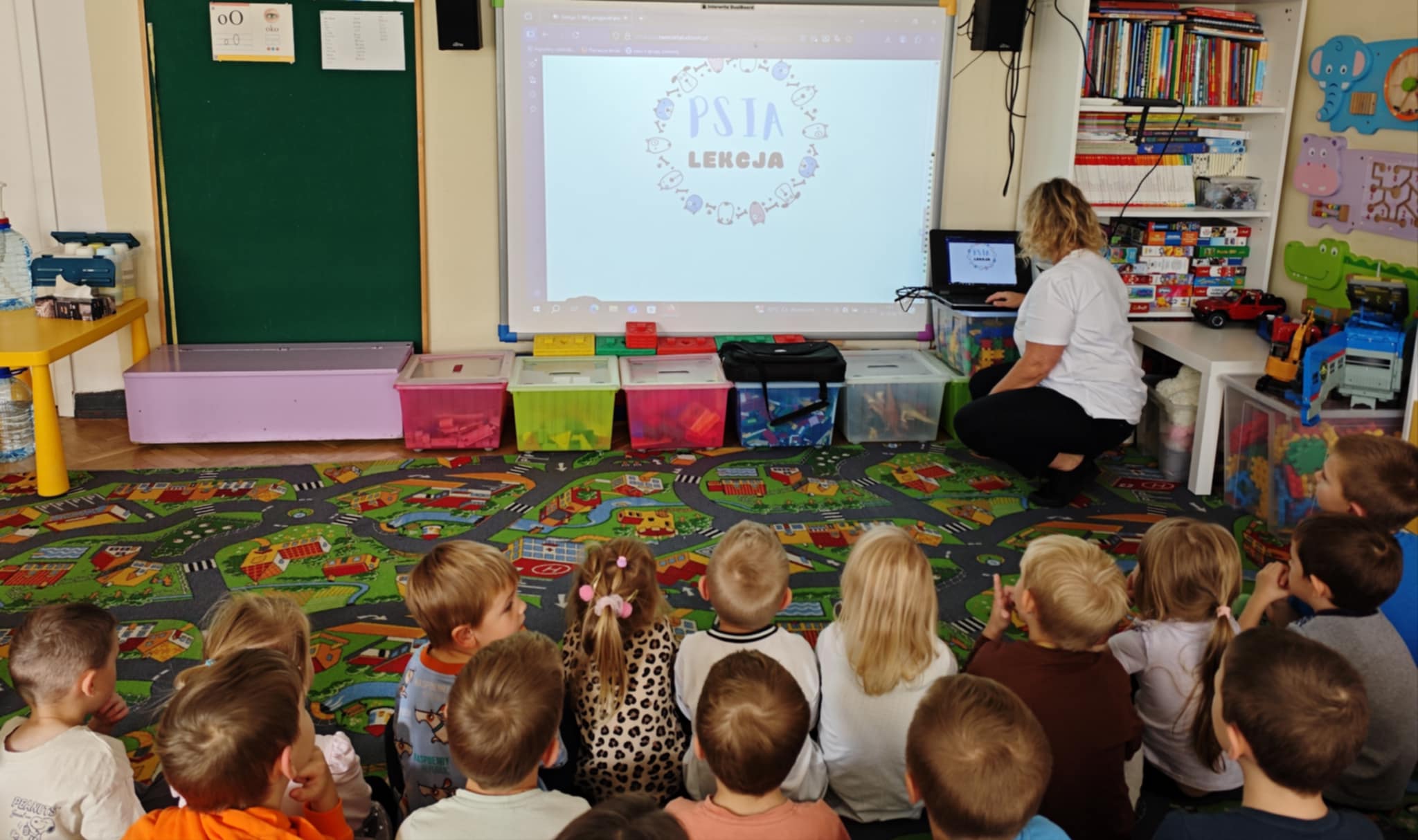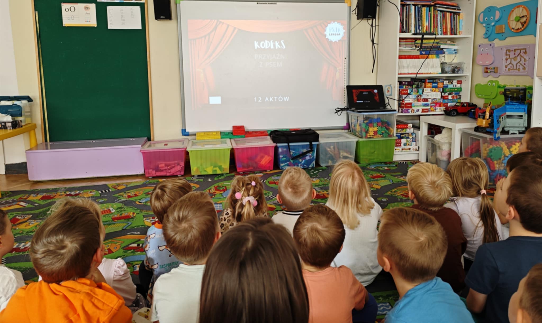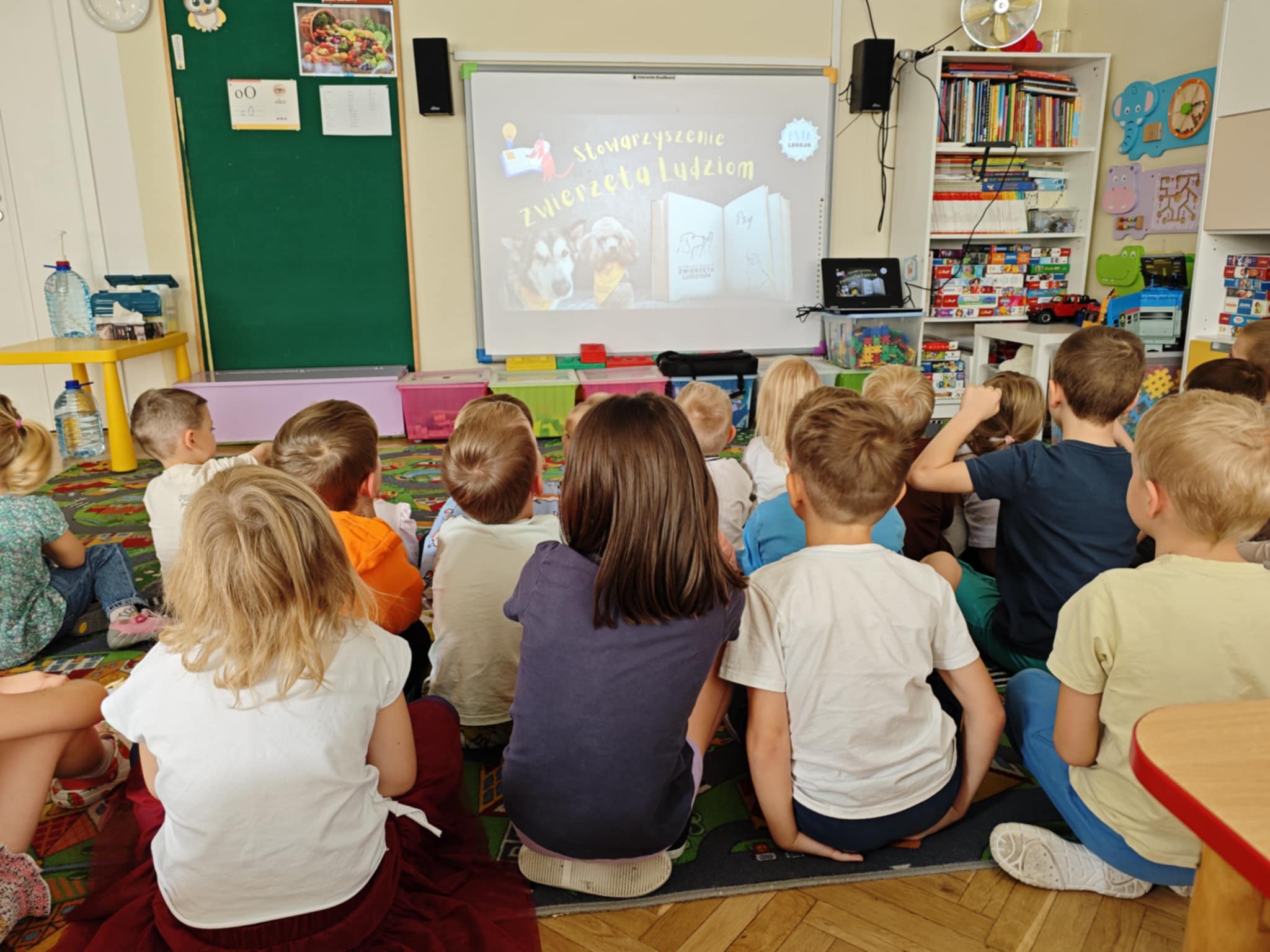 Dzieci z grupy zielonej i niebieskiej biorą udział w programie "Psia lekcja", jednocześnie angażując się w pomoc Stowarzyszeniu Zwierzęta Ludziom, które poprzez dogoterapię wspiera na szpitalnych oddziałach chore dzieci.