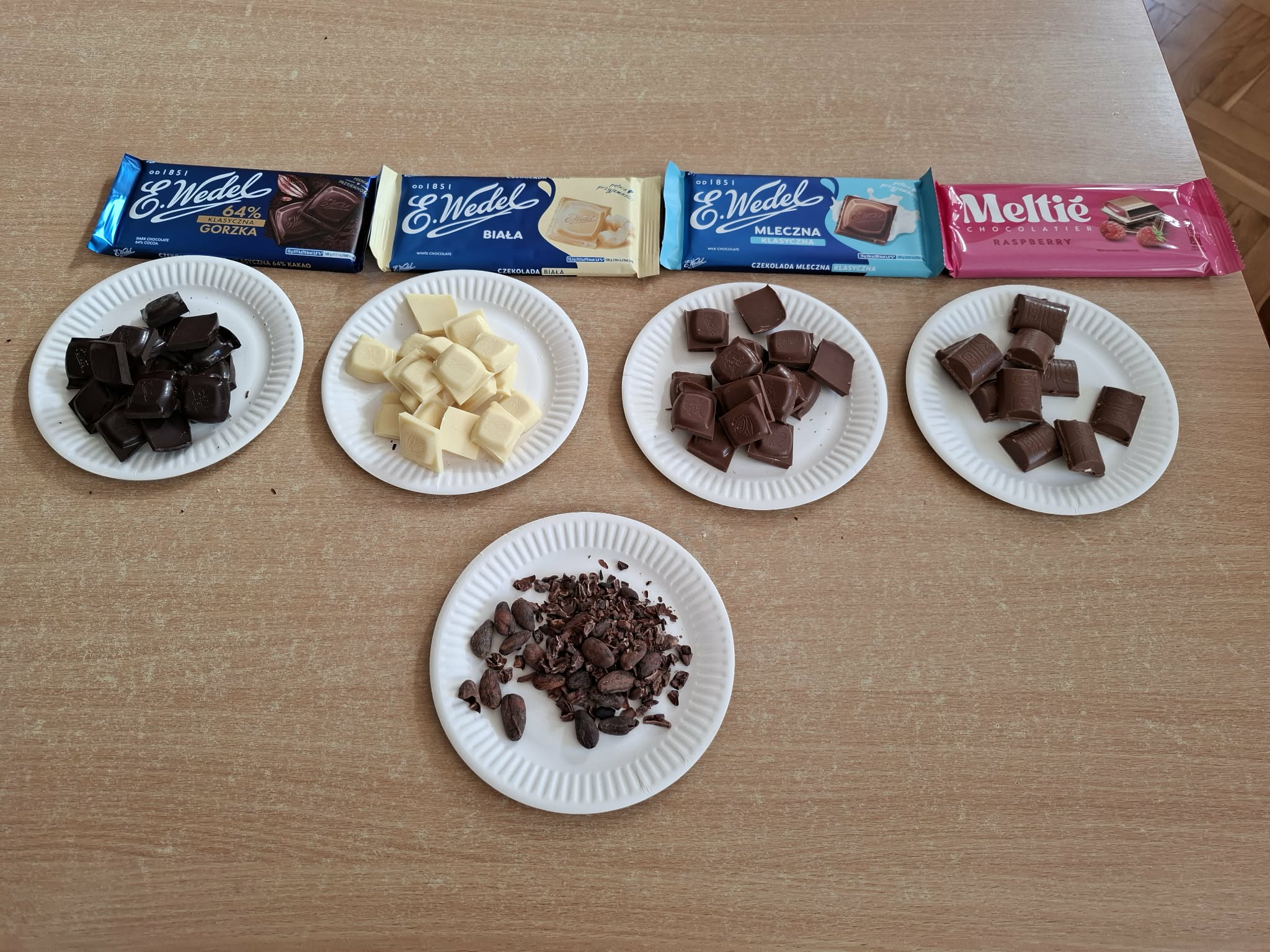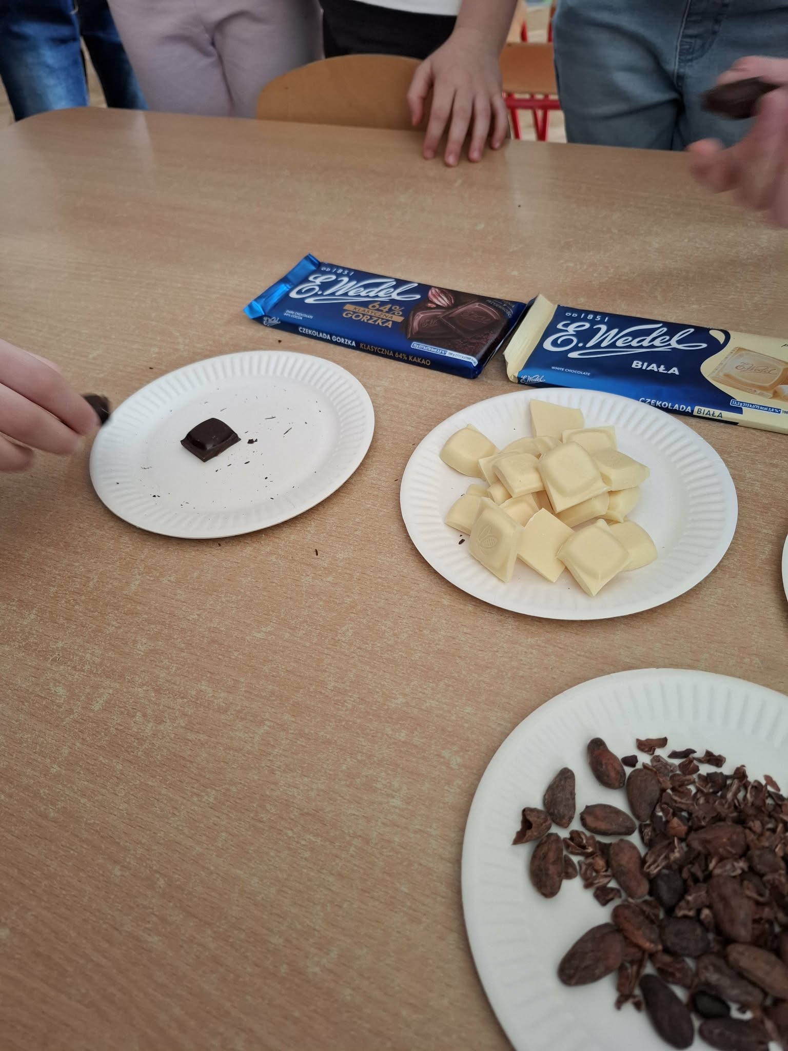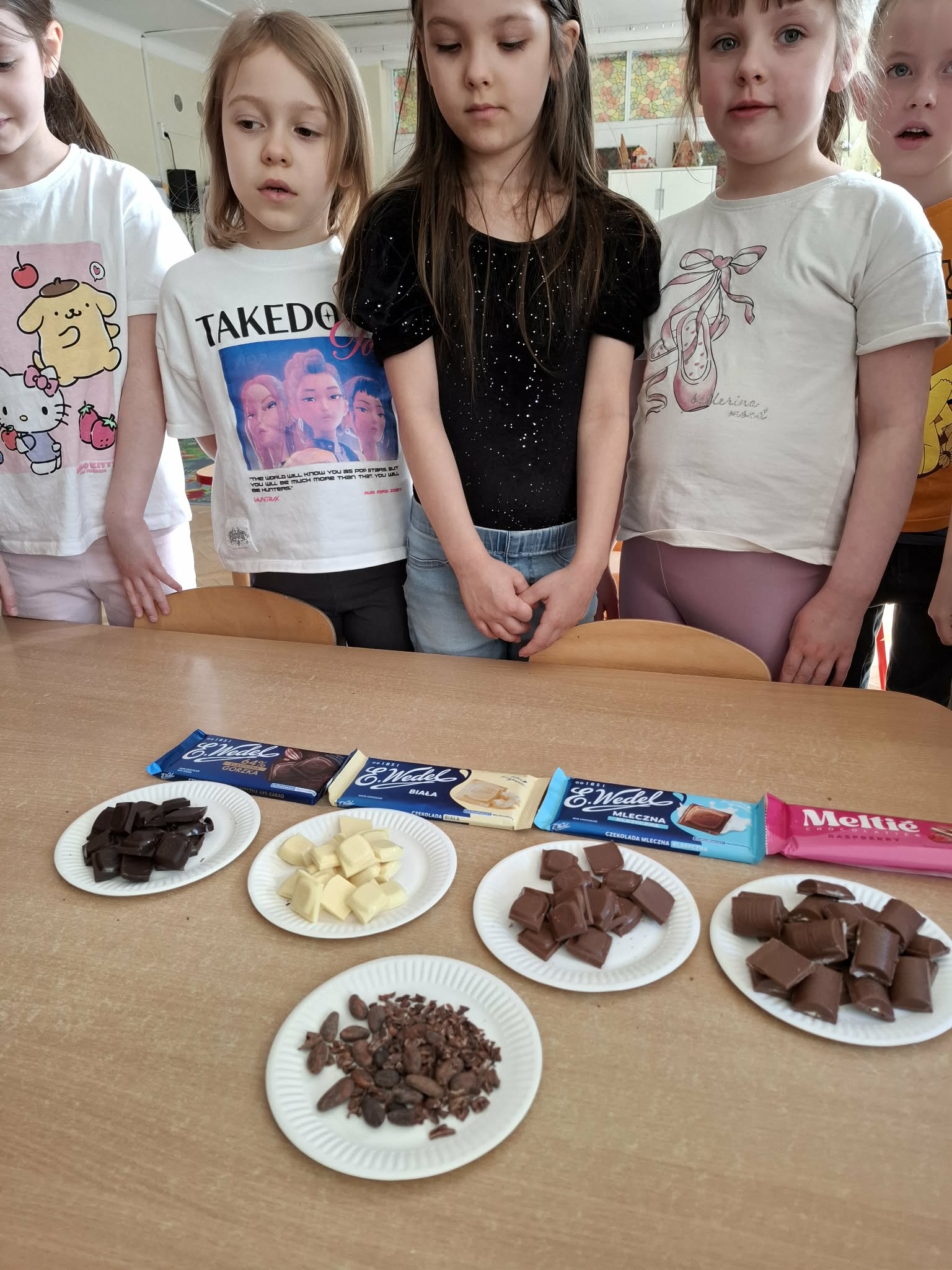 W dniu dzisiejszym obchodziliśmy Dzień czekolady - najsłodszy dzień w roku :). Dowiedzieliśmy się jak się produkuje czekoladę, obejrzeliśmy naturalne ziarna kakaowca, a następnie konsumowaliśmy 4 rodzaje czekolad, mniam...
