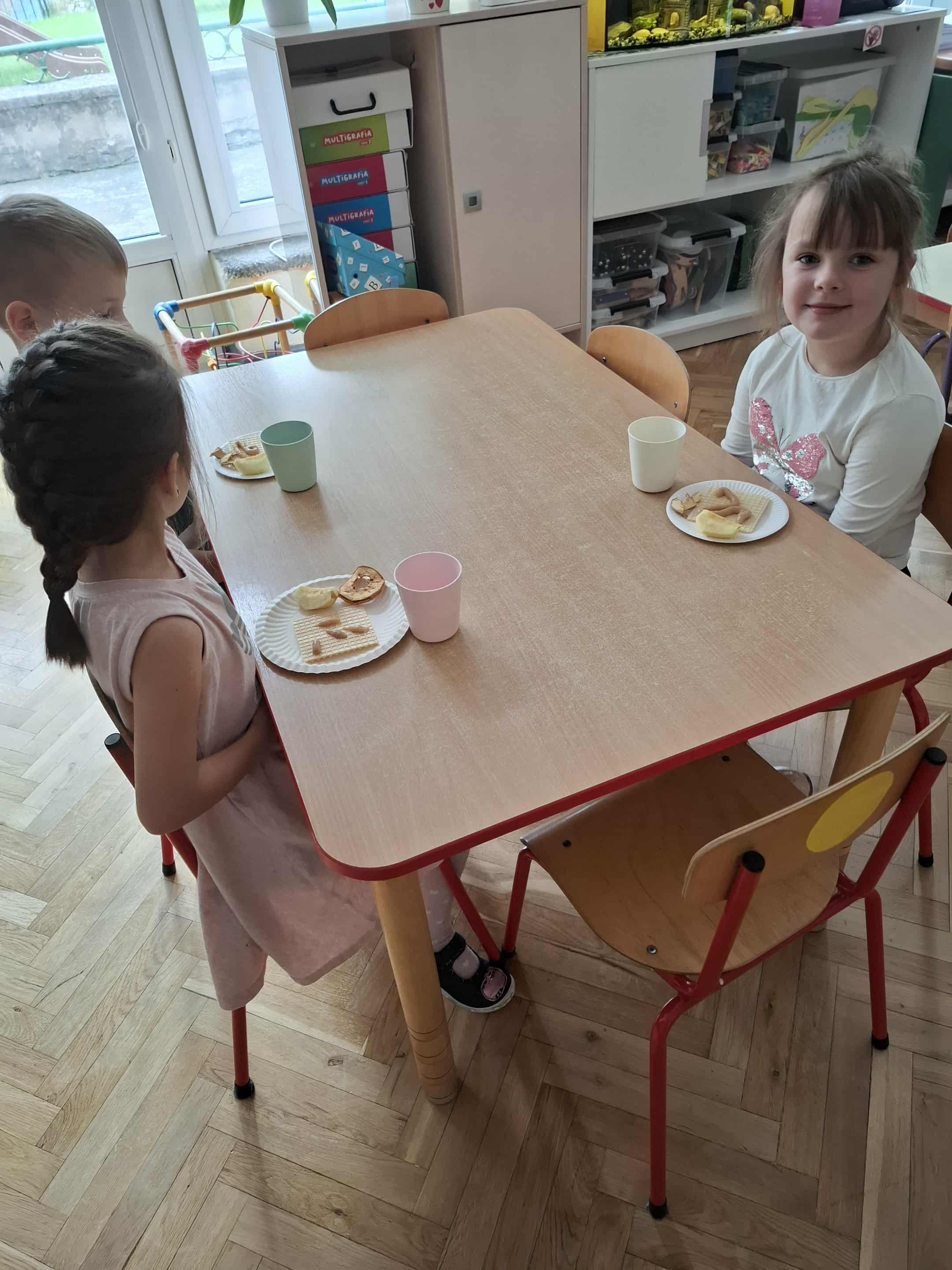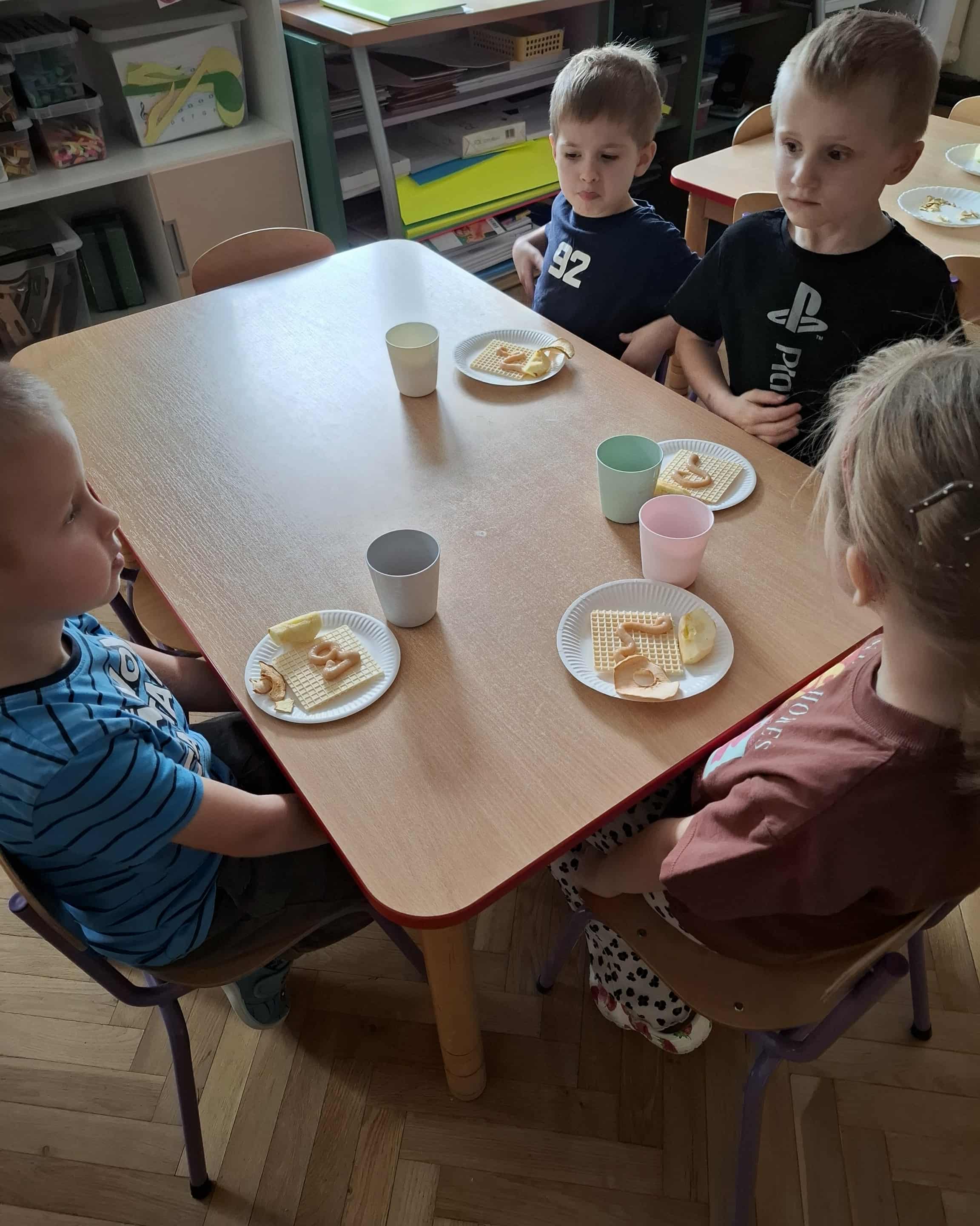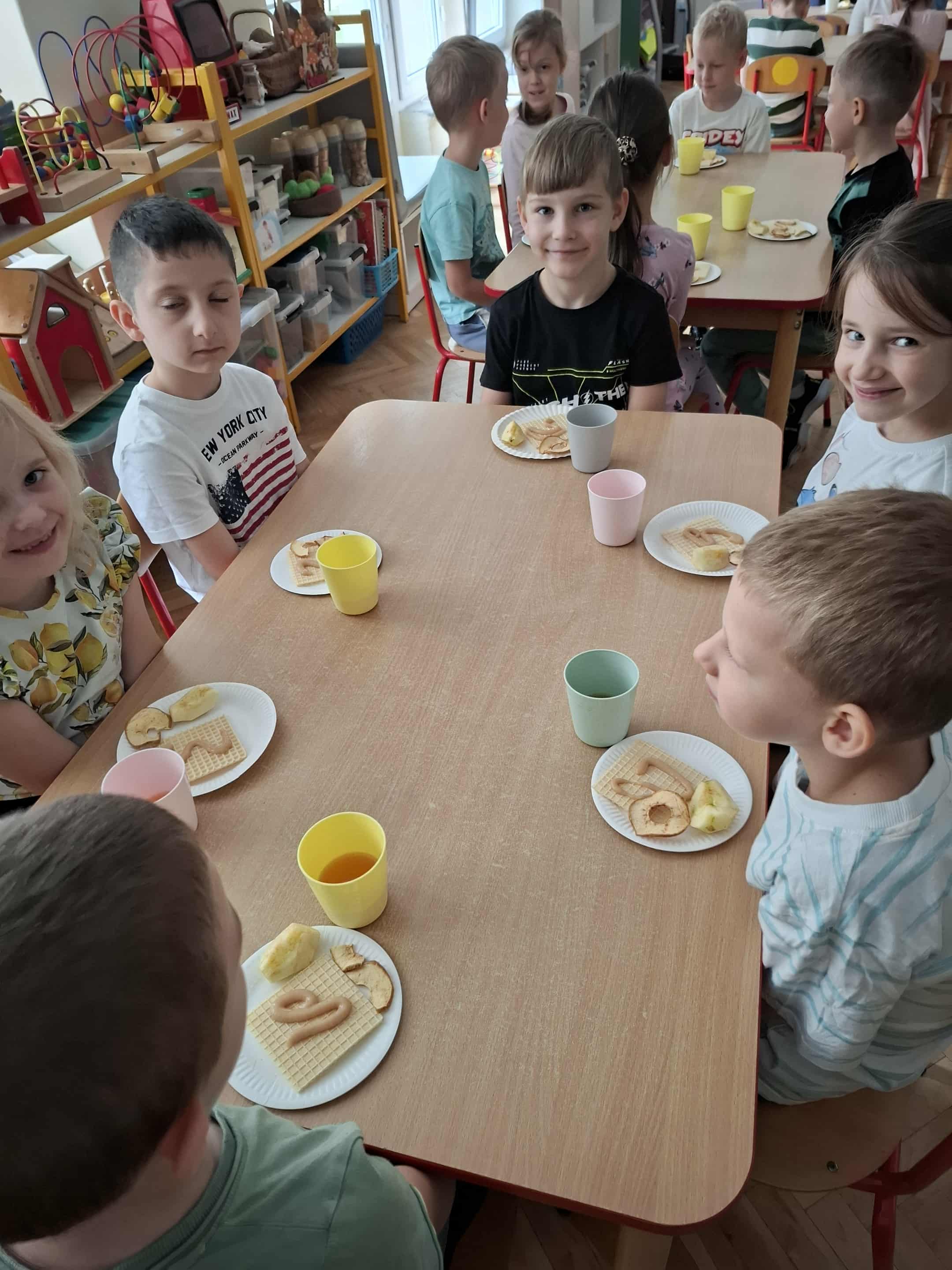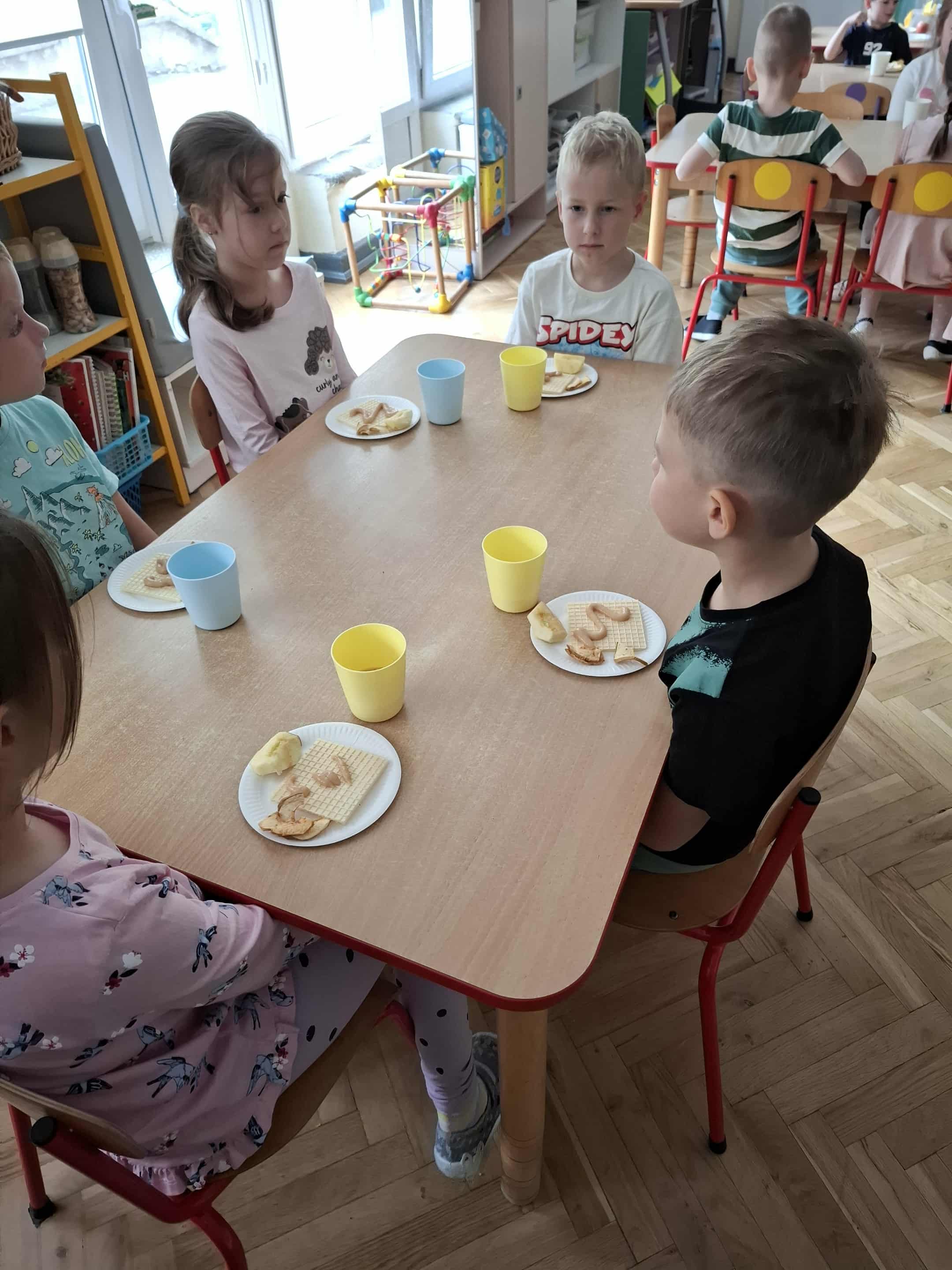 W dniu dzisiejszym obchodziliśmy Dzień jabłka. Poznaliśmy budowę tego owocu, kształt, barwę, opisywaliśmy jego walory zdrowotne i smakowe, bawiliśmy się przy piosence "Małe czerwone jabłuszko", a także obejrzeliśmy film edukacyjny i wykonaliśmy pracę plastyczną. A później degustowaliśmy różne rodzaje jabłek i przetwory wykonane na bazie jabłka.