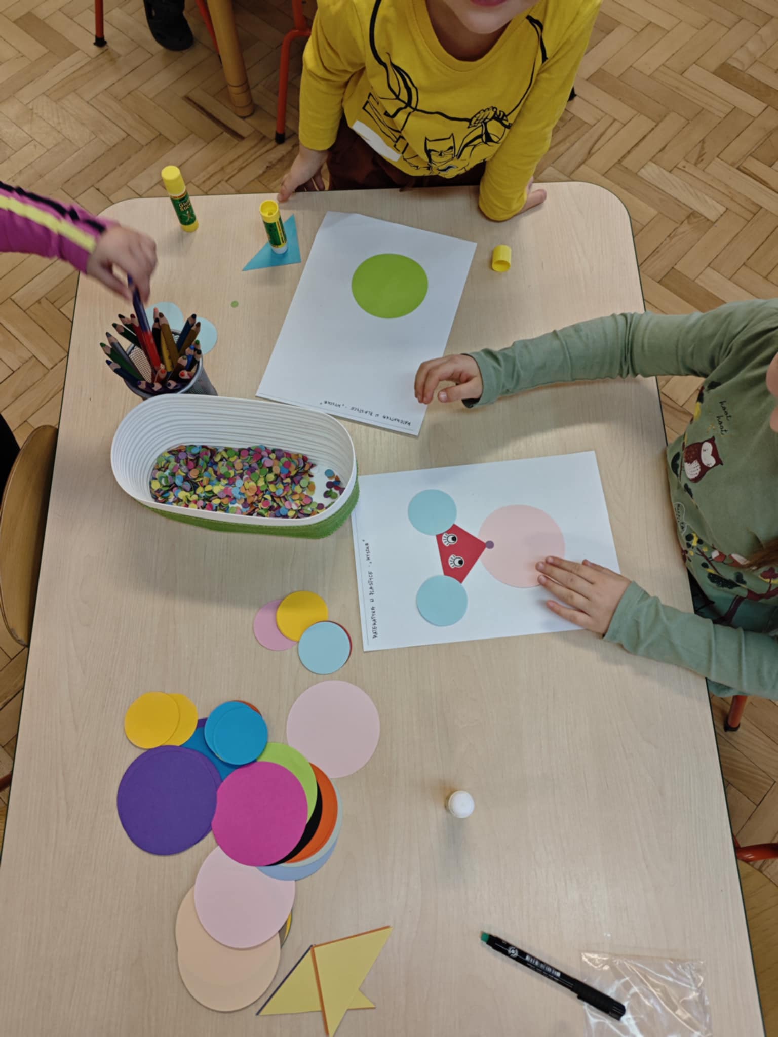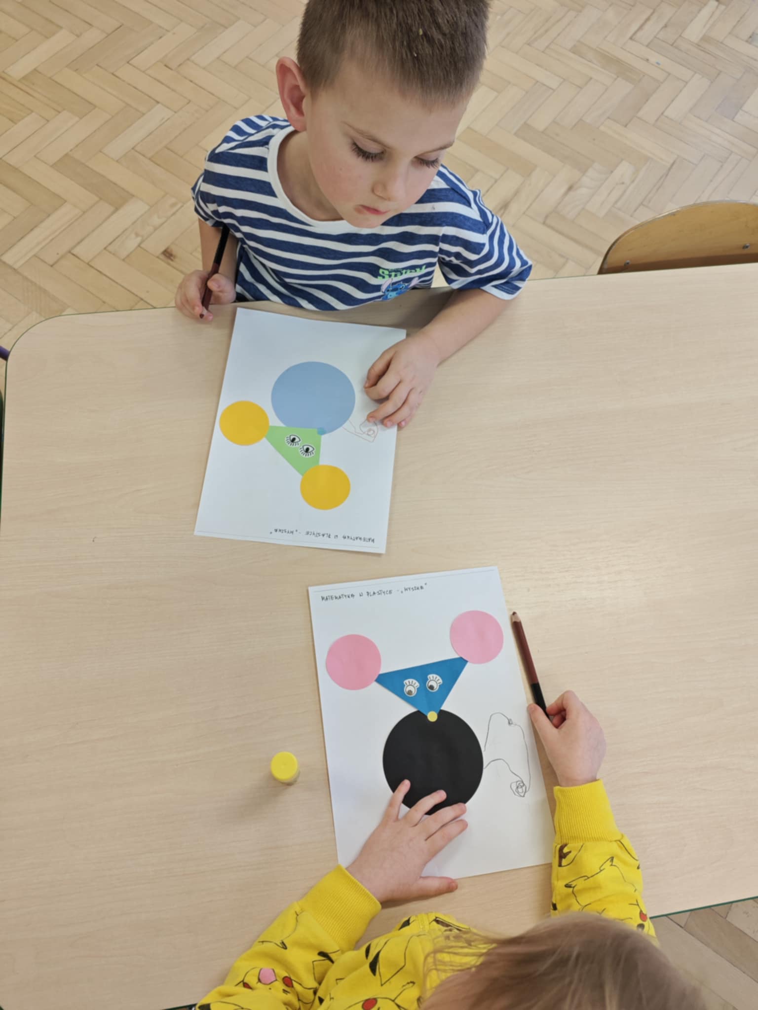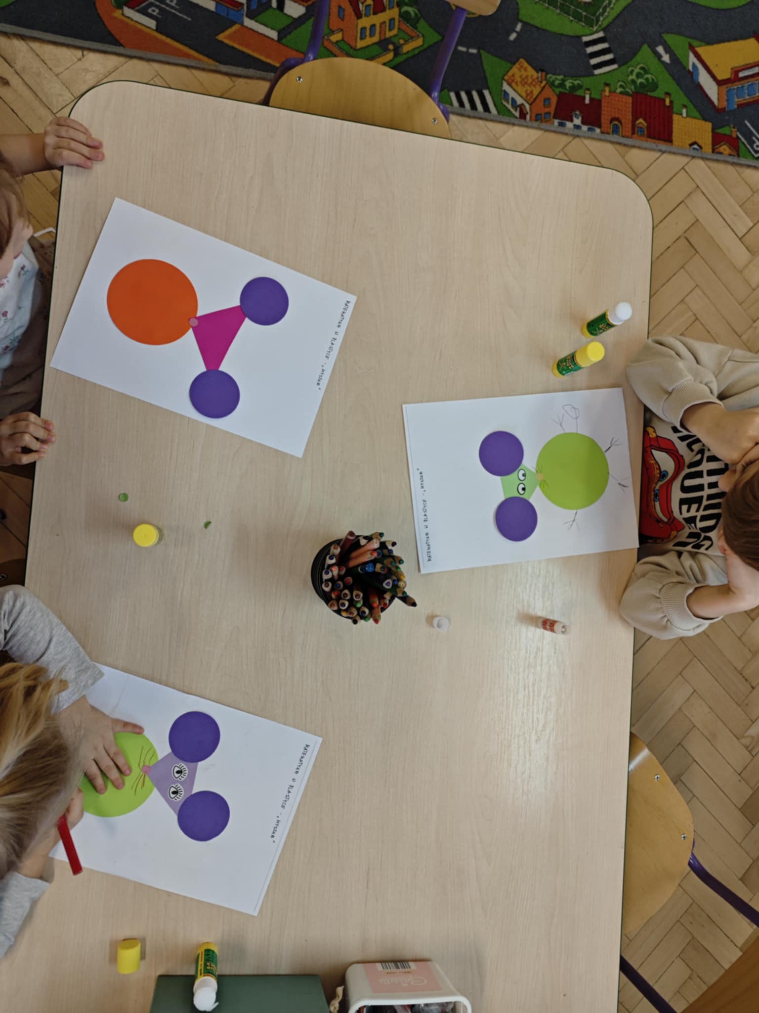 Bawimy się i utrwalamy znajomość figur geometrycznych, przeliczanie elementów, rozpoznawanie wielkości, ćwiczymy umiejętność planowania pracy na kartce papieru.