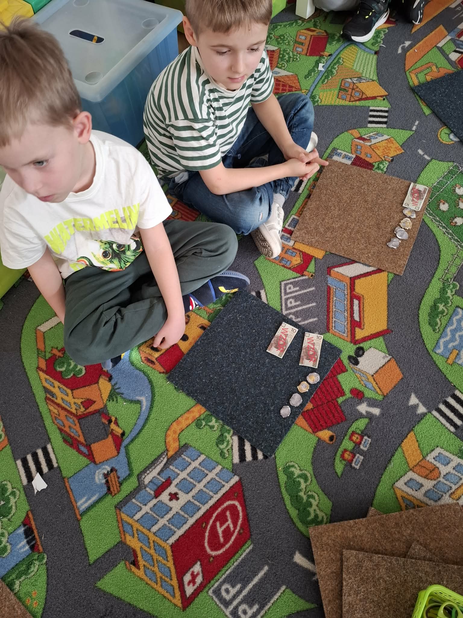 W dniu dzisiejszym podczas zajęć edukacyjnych poznaliśmy historię powstania pieniędzy, poznaliśmy monety i banknoty, a także ćwiczyliśmy dodawanie i odejmowanie w zakresie 10.