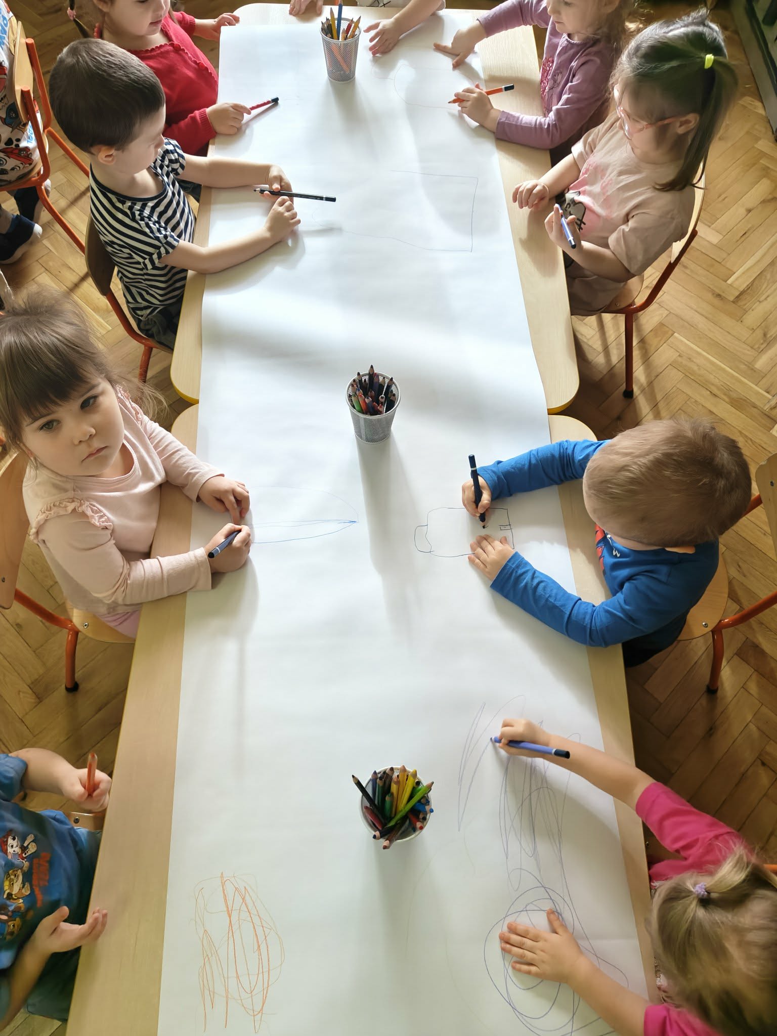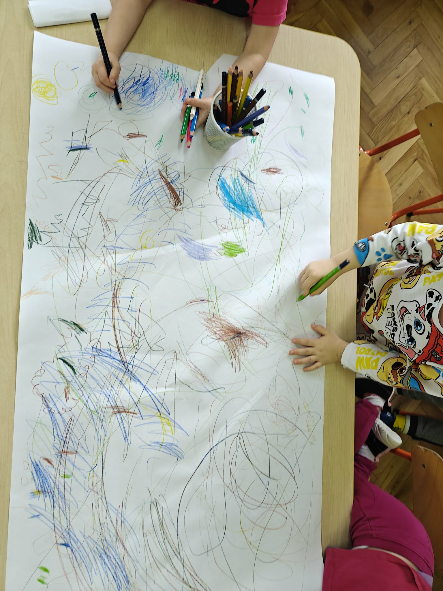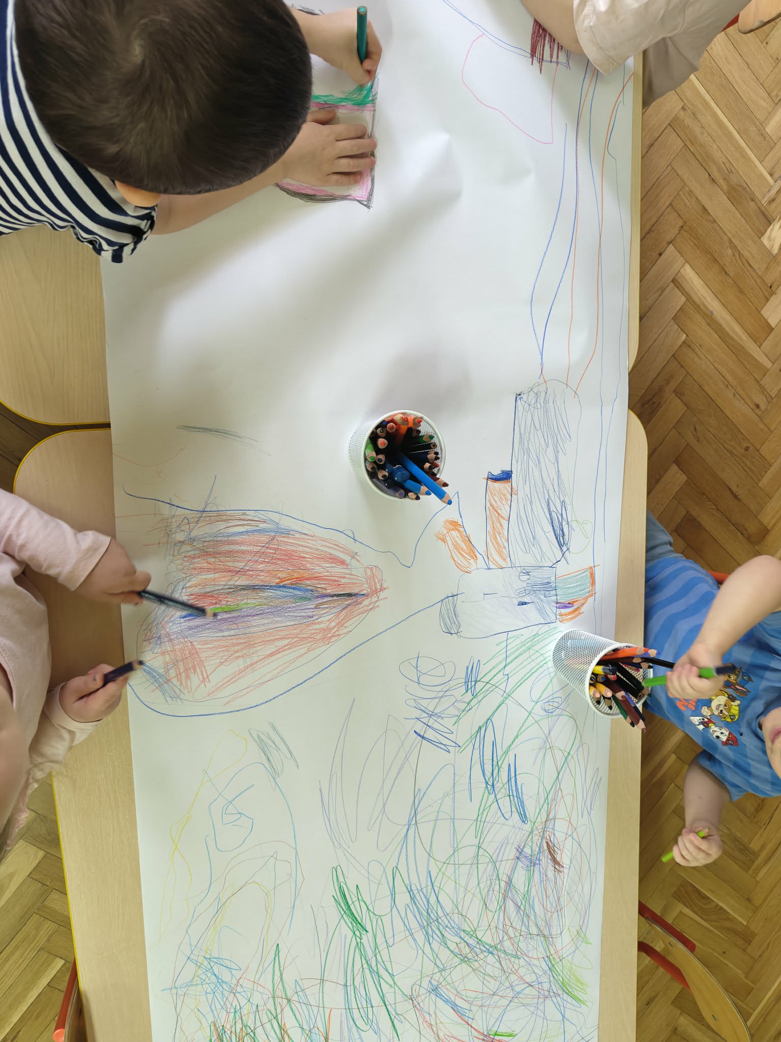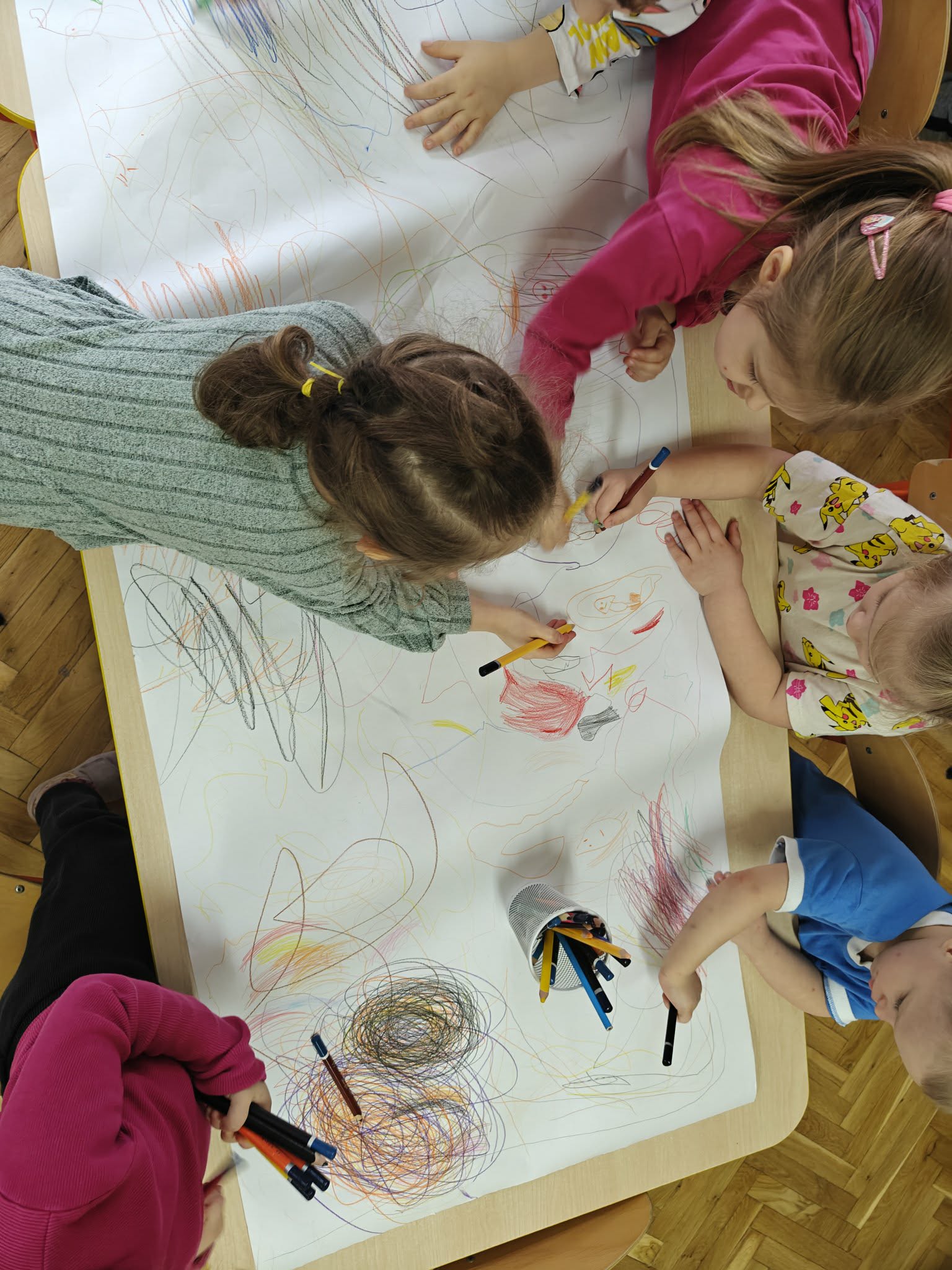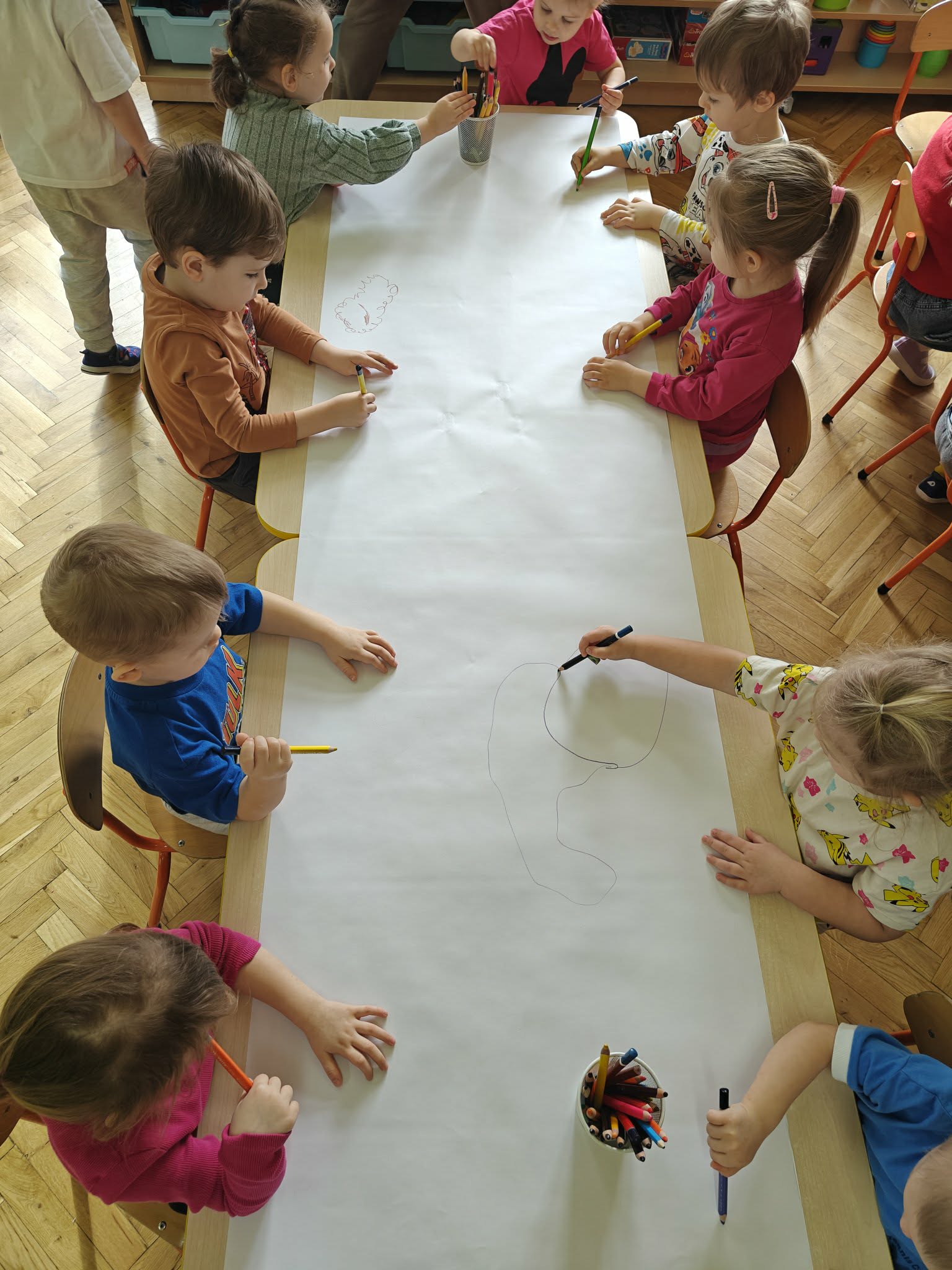 Co można stworzyć z kreski wspólnie? Otóż takie wspaniałe arcydzieła! Przy okazji uczymy się współpracy i współdziałania.