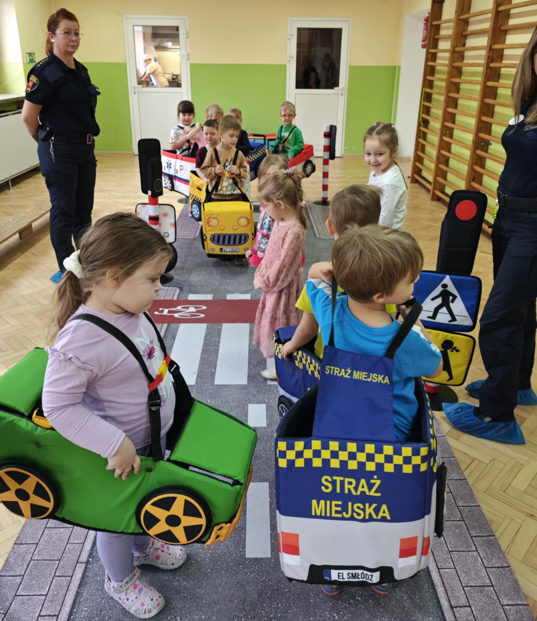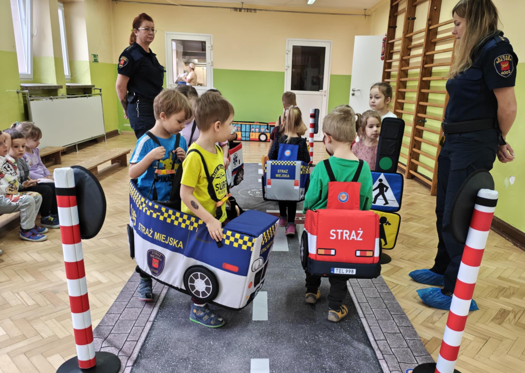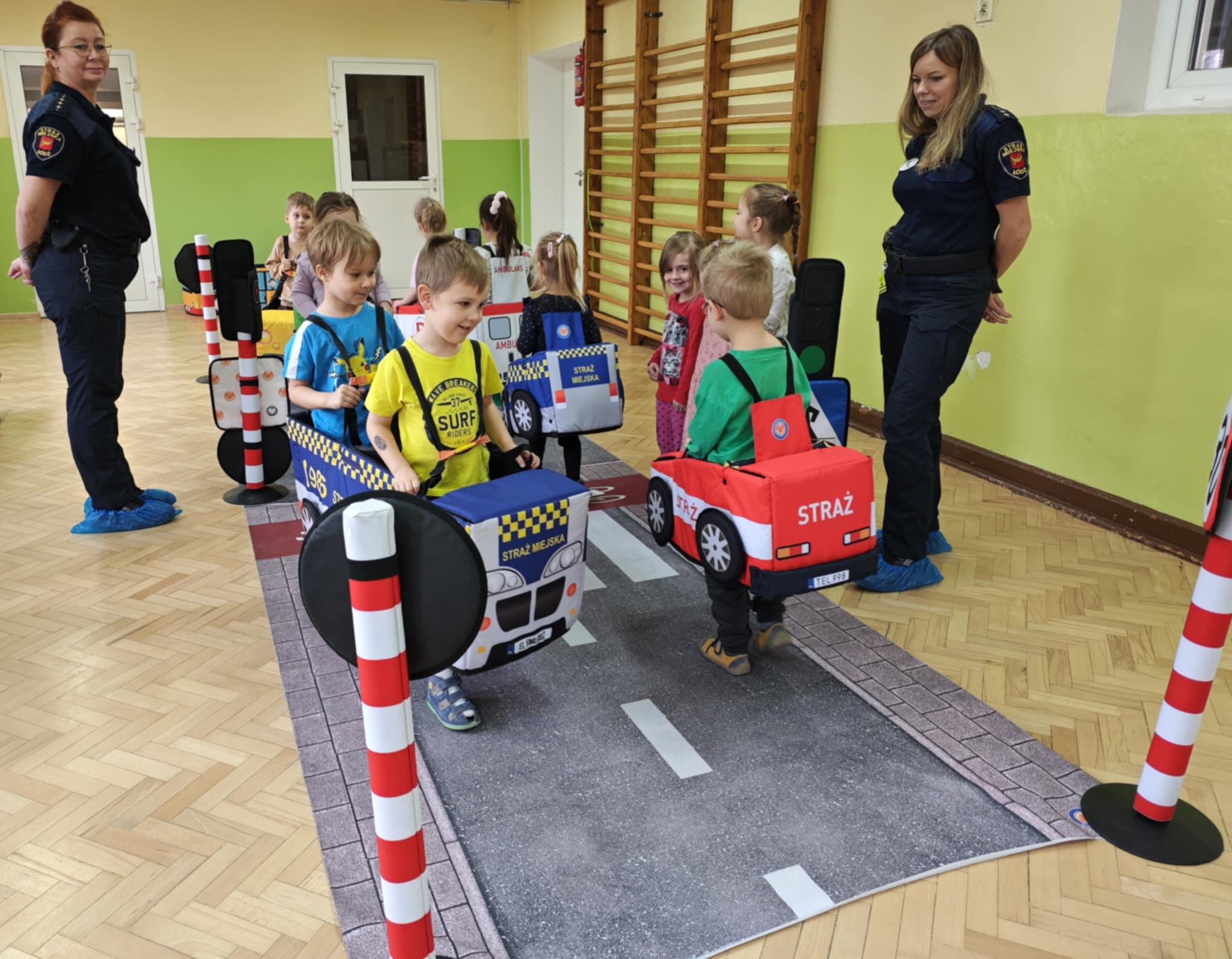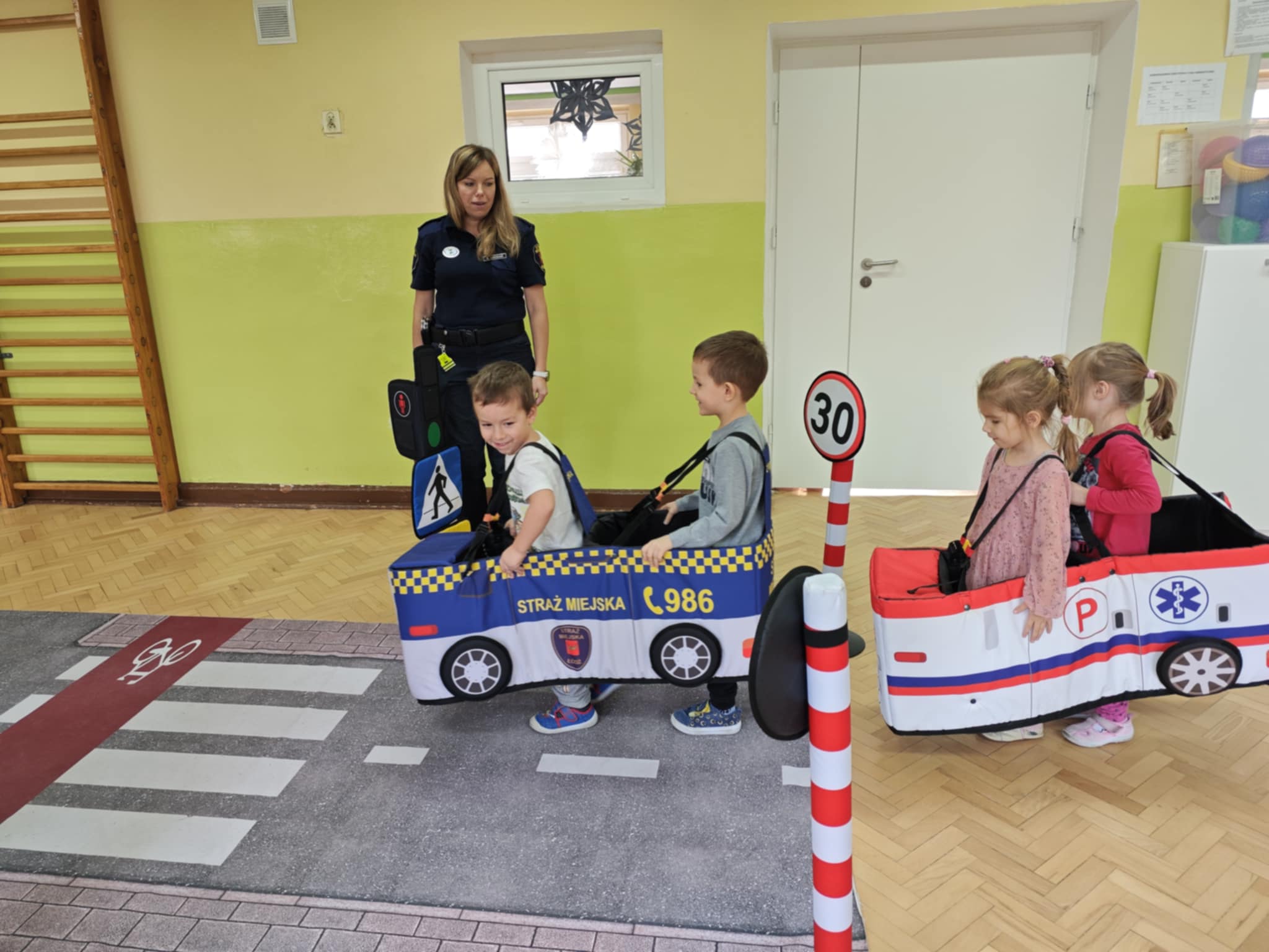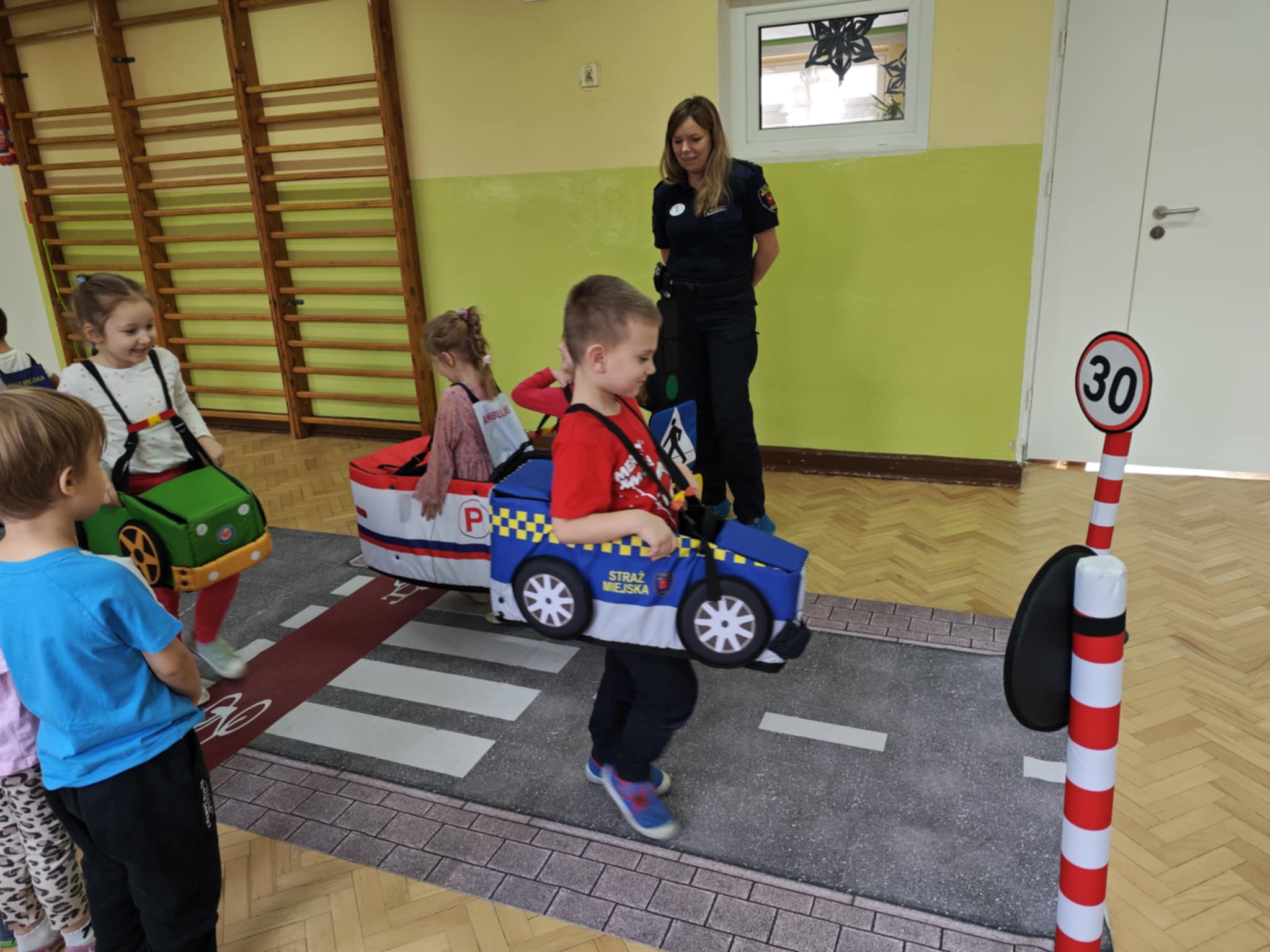 W piątek nasze Przedszkole odwiedzili przedstawiciele Straży Miejskiej, by omówić z dziećmi zasady bezpieczeństwa panujące na drodze, w domu, podczas spotkania z nieznajomym, czy też zgubienia się. Z doświadczenia wiemy, że takich rozmów nigdy za wiele. Później dzieci same wcielały się w rolę kierowców i pieszych, oczywiście stosując się do zasad i znaków drogowych.