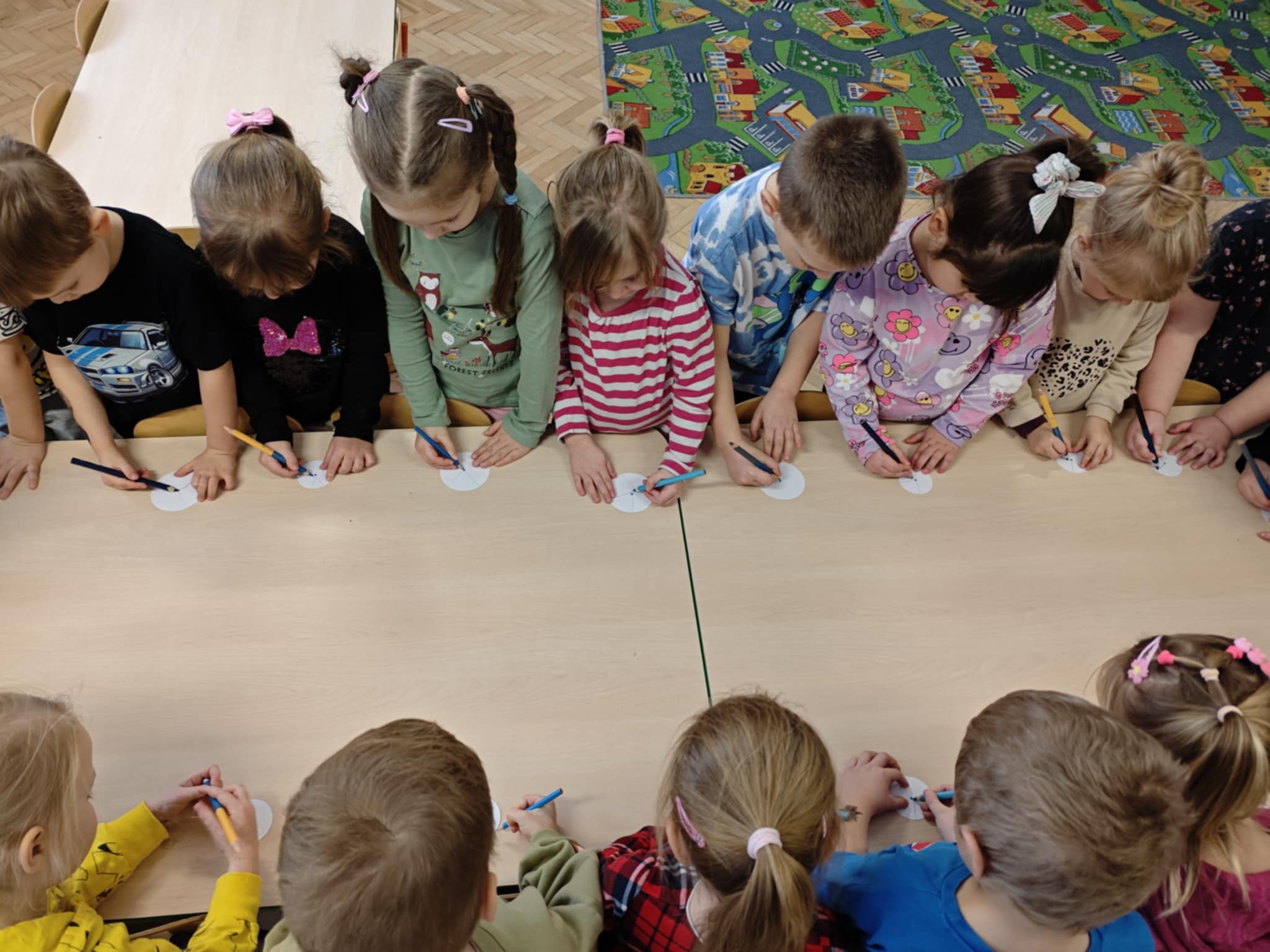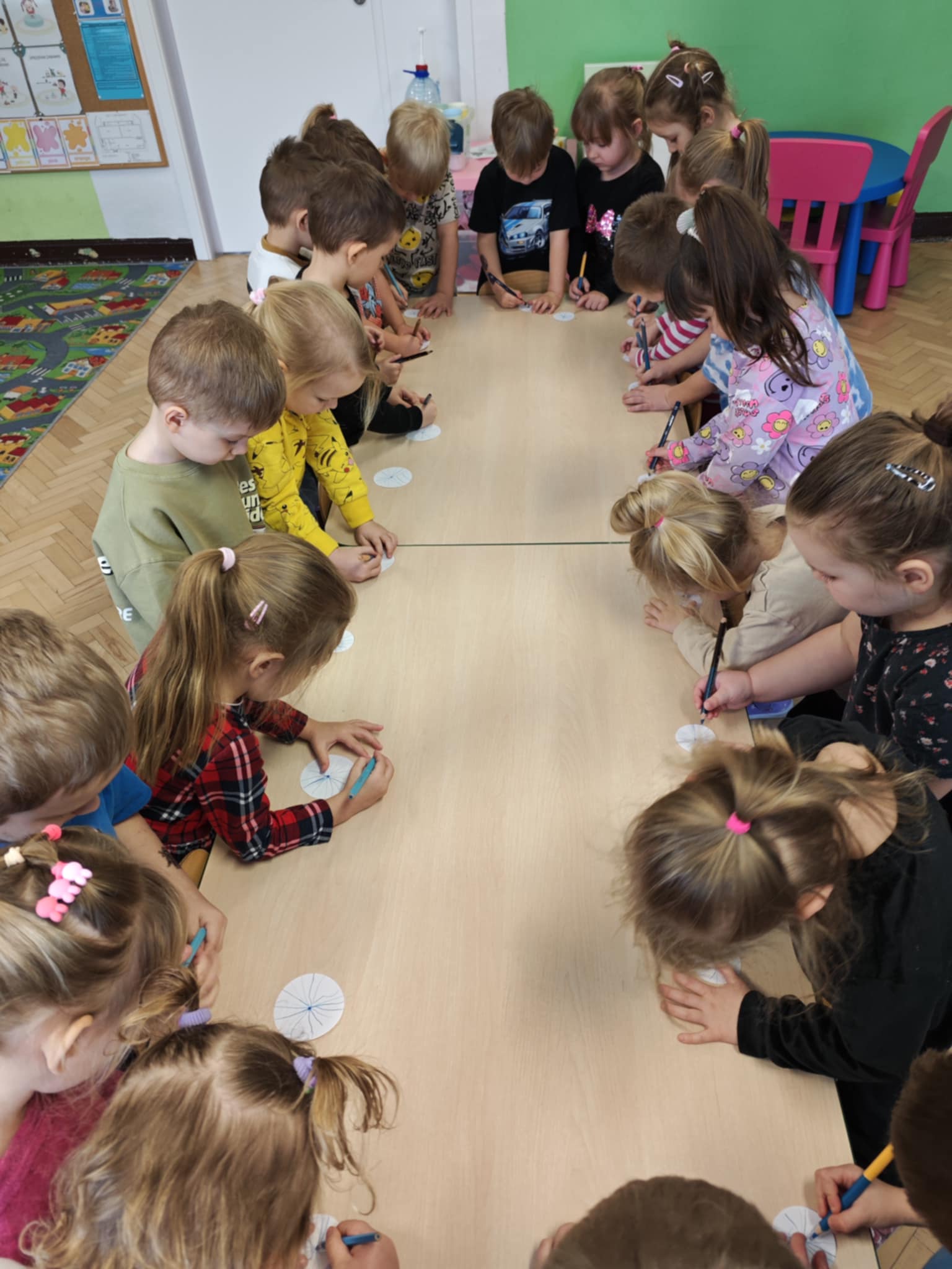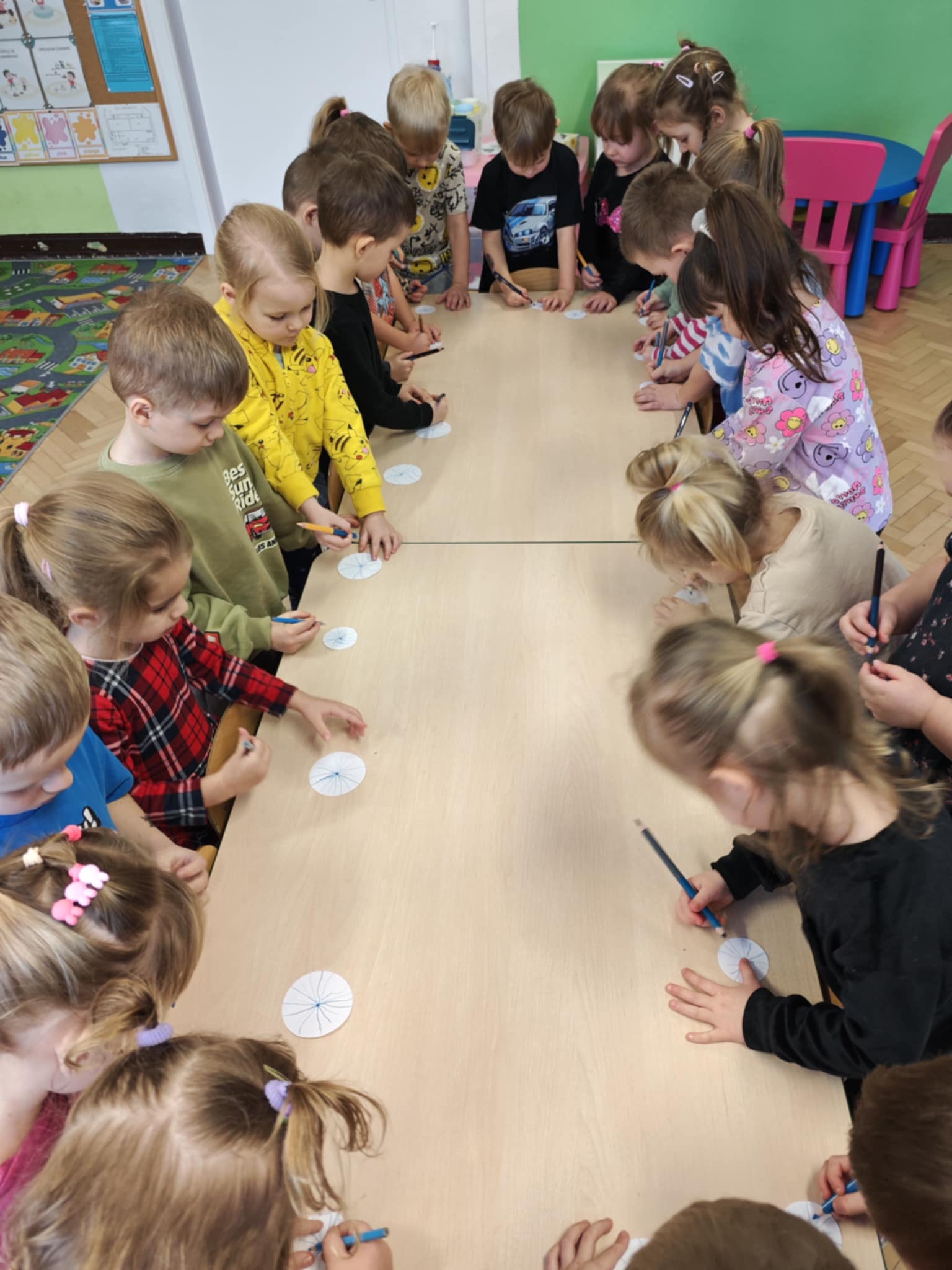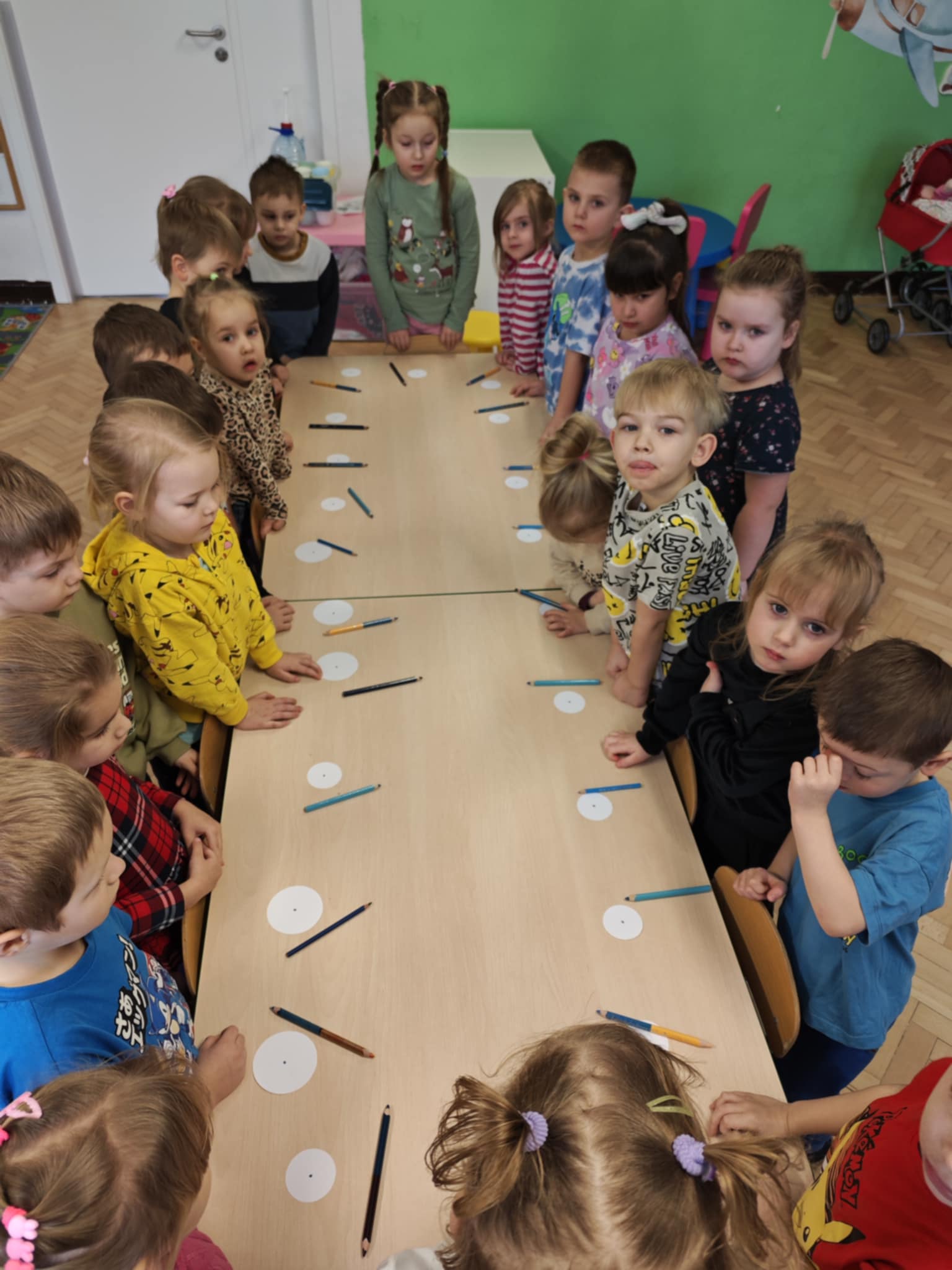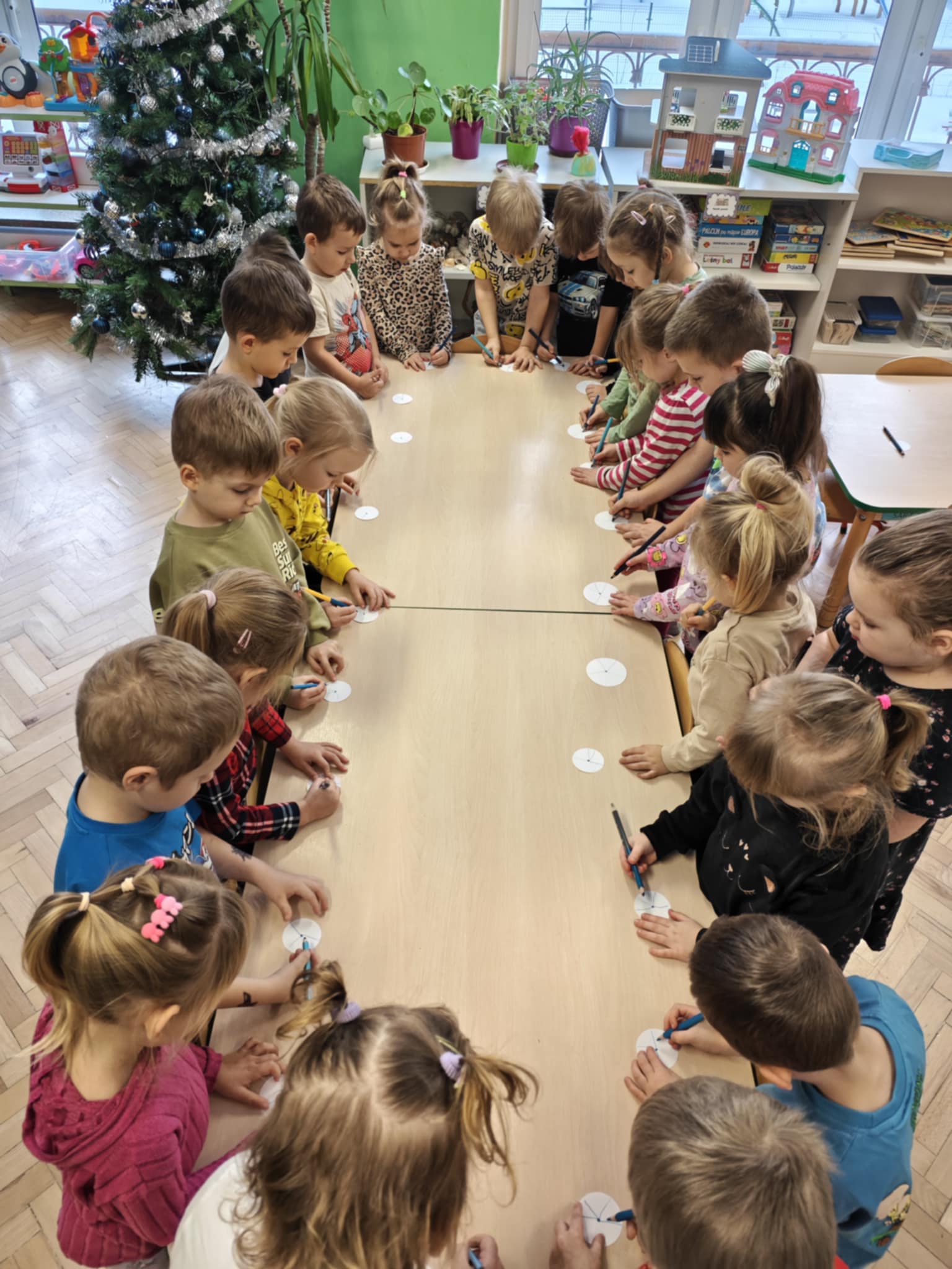 Dziś uczyliśmy się wzajemnej współpracy i rozumienia poleceń w zabawie polegającej na rysowaniu pojedynczych kresek od kropki zgodnie z liczeniem nauczyciela i przesuwaniu się do kolejnej śnieżynki. Na każdej śnieżynce każdy uczestnik zabawy mógł narysować tylko jedną kreskę. To było trudne zadanie, ale daliśmy radę.