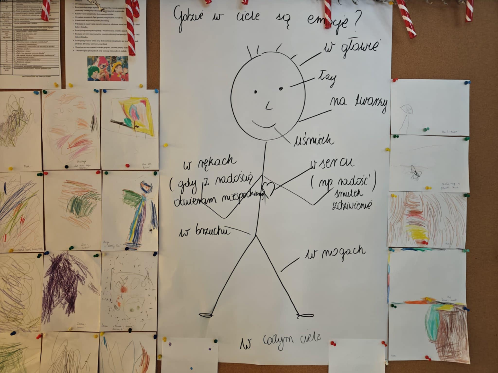 W czasie zajęć podczas otwierania dużego pudełka przyniesionego przez nauczyciela, okazało się, że w środku jest kolejne i kolejne i jeszcze jedno. A w tym ostatnim nie ma nic...Dzieci poczuły zdziwienie, smutek i rozczarowanie. Wspólnie stworzyliśmy mapę, gdzie w naszym ciele mogą mieszkać emocje z ich przykładami. Dzieci narysowały różne sytuacje i emocje jakie wtedy im towarzyszyły. Oczywiście na zakończenie była czekoladka na poprawę humoru.